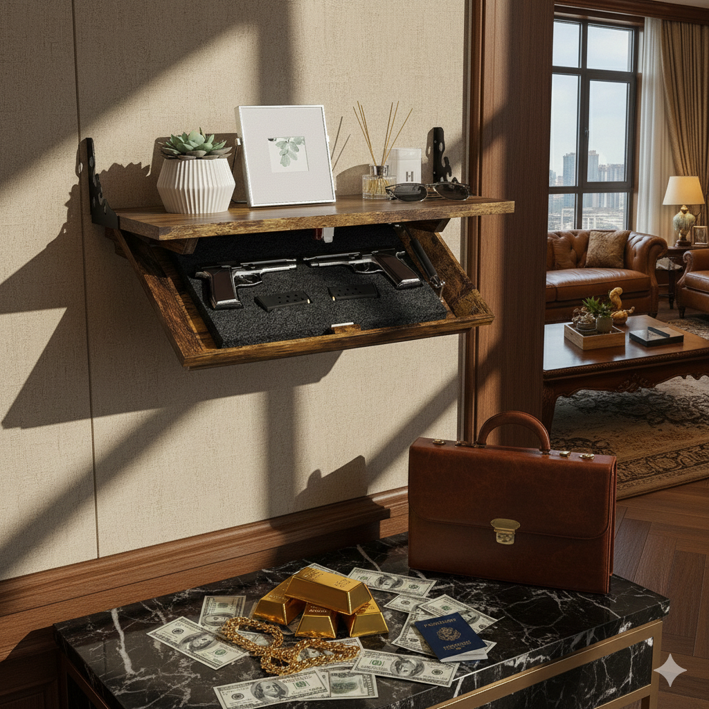 Das HausVersteck™ Wandregal verbindet offene Präsentation mit diskreter Aufbewahrung.
